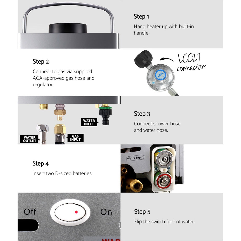 Devanti Portable Gas Water Heater 8L/Min With Pump LPG System Grey