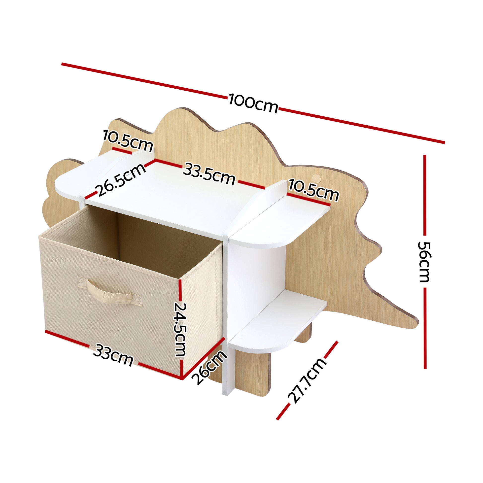 This dinosaur-shaped kids bookshelf is a fun and practical storage solution for children's bedrooms and playrooms. Designed with 2-tier open shelves and a fabric drawer, it keeps books and toys neatly organised while remaining easy for kids to access.
