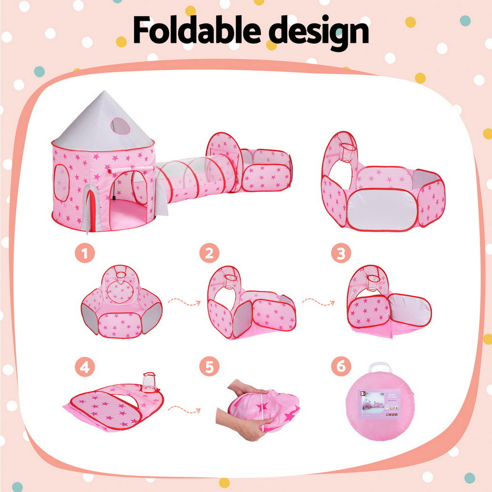 Keezi Kids Playhouse Play Tent Pop Up Castle Crawl Tunnel Basketball Hoop Pink